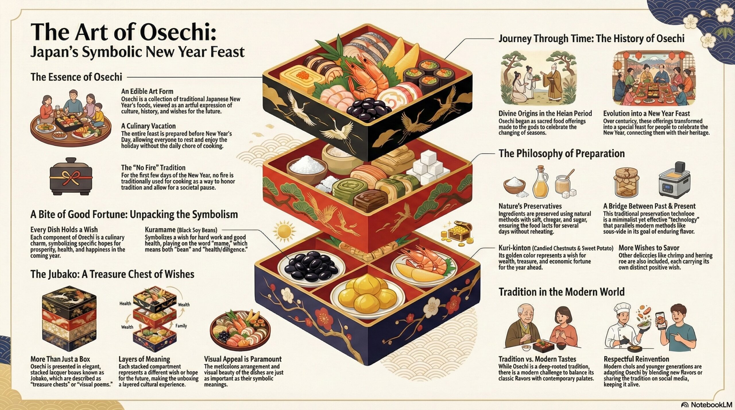 Traditionally, it was taboo to use fire to cook during the first three days of the New Year to avoid disturbing the gods. Osechi dishes are prepared in advance to be preserved, allowing everyone to rest during the holidays.
