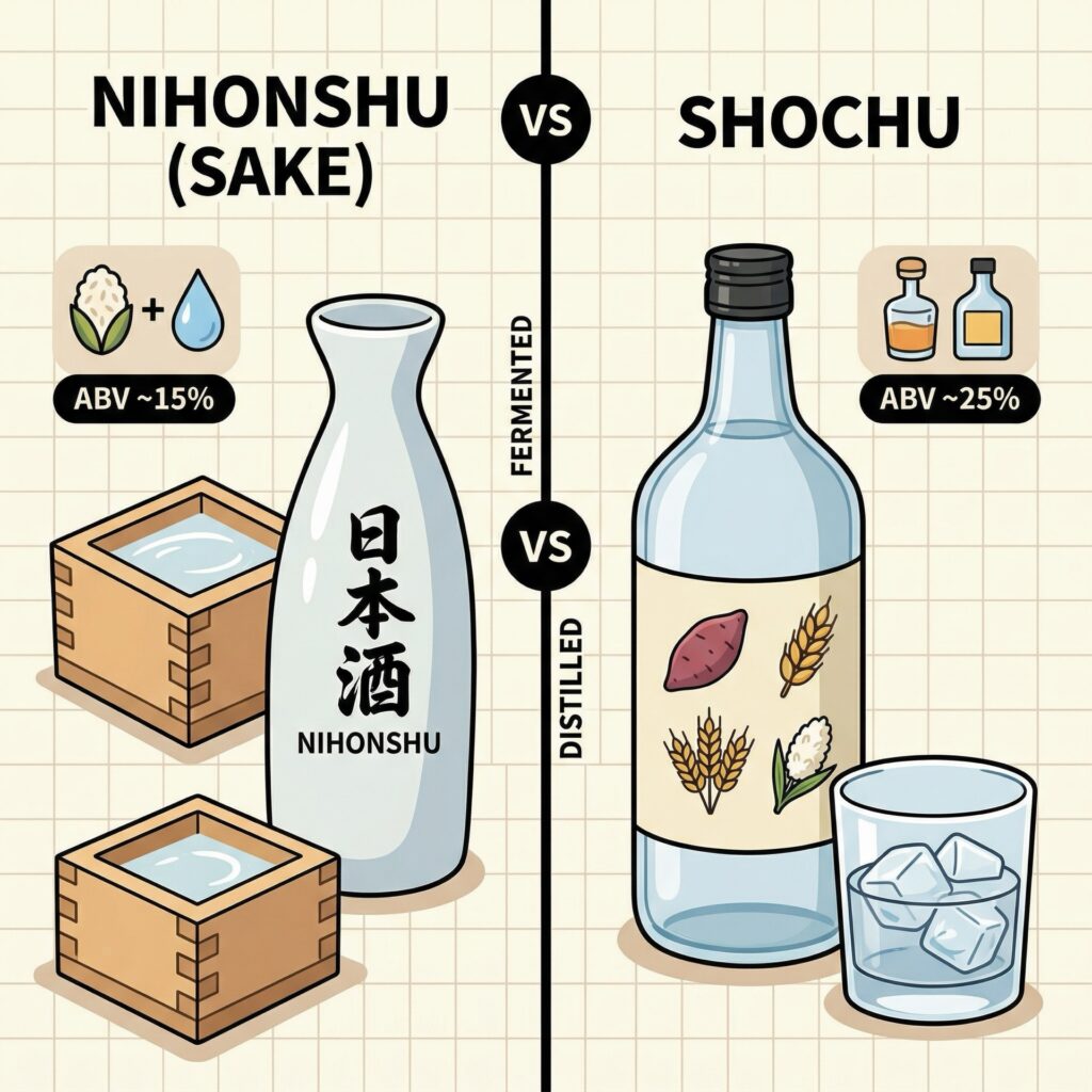 “Shochu,” on the other hand, is a distilled spirit. While sake has an alcohol content of around 15%, Shochu typically sits around 25%.