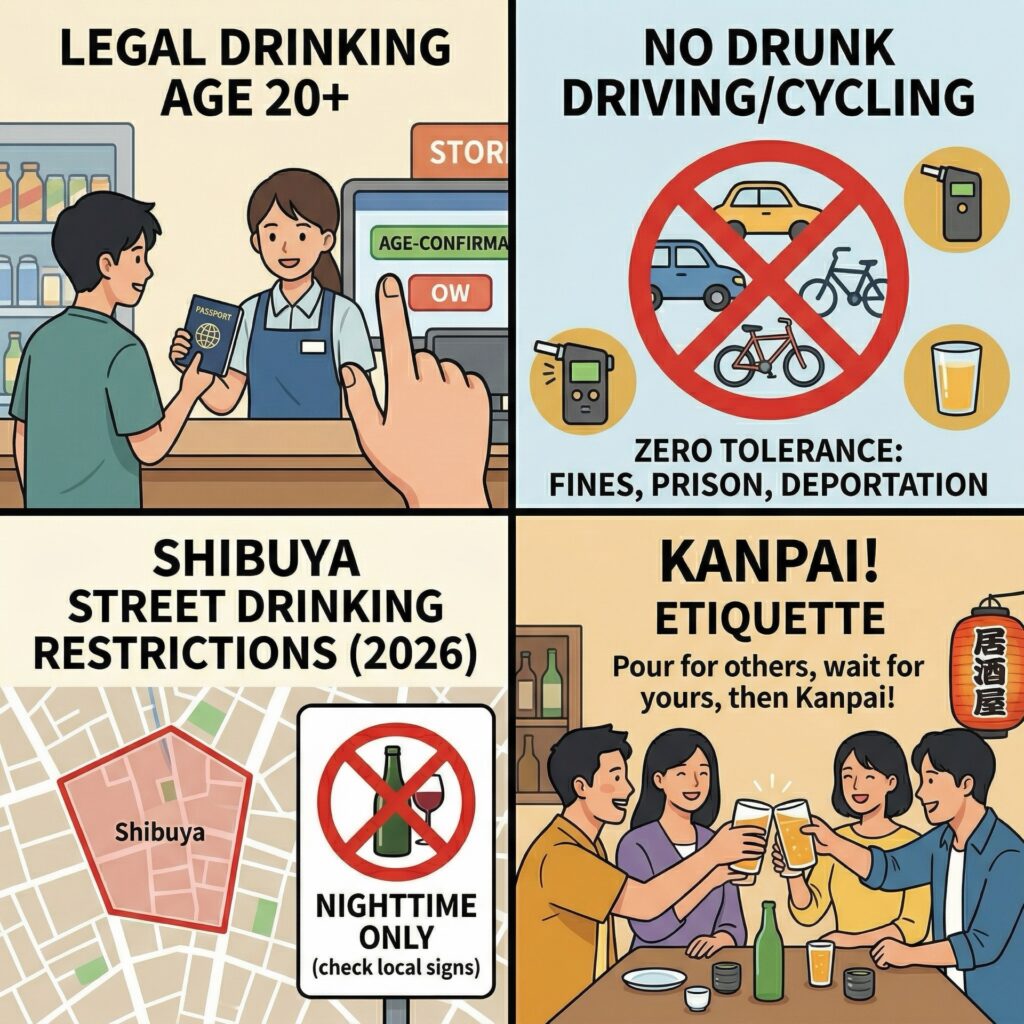 Furthermore, while drinking alcohol on the streets or in parks has historically been legal and normal, recent overtourism issues have led areas like Shibuya to restrict public drinking on streets during nighttime hours all year round in 2026, so always check local signs.