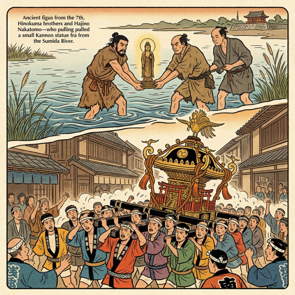 Every May, the historic district of Asakusa transforms into a sea of pure, vibrant energy during the Sanja Matsuri. Known as one of Tokyo’s largest and wildest festivals, it holds over 700 years of history. “Sanja” translates to “Three Shrines,” honoring the three ordinary fishermen and a village chief who founded Senso-ji Temple in the 7th century after discovering a sacred statue of the Kannon goddess in the nearby Sumida River.