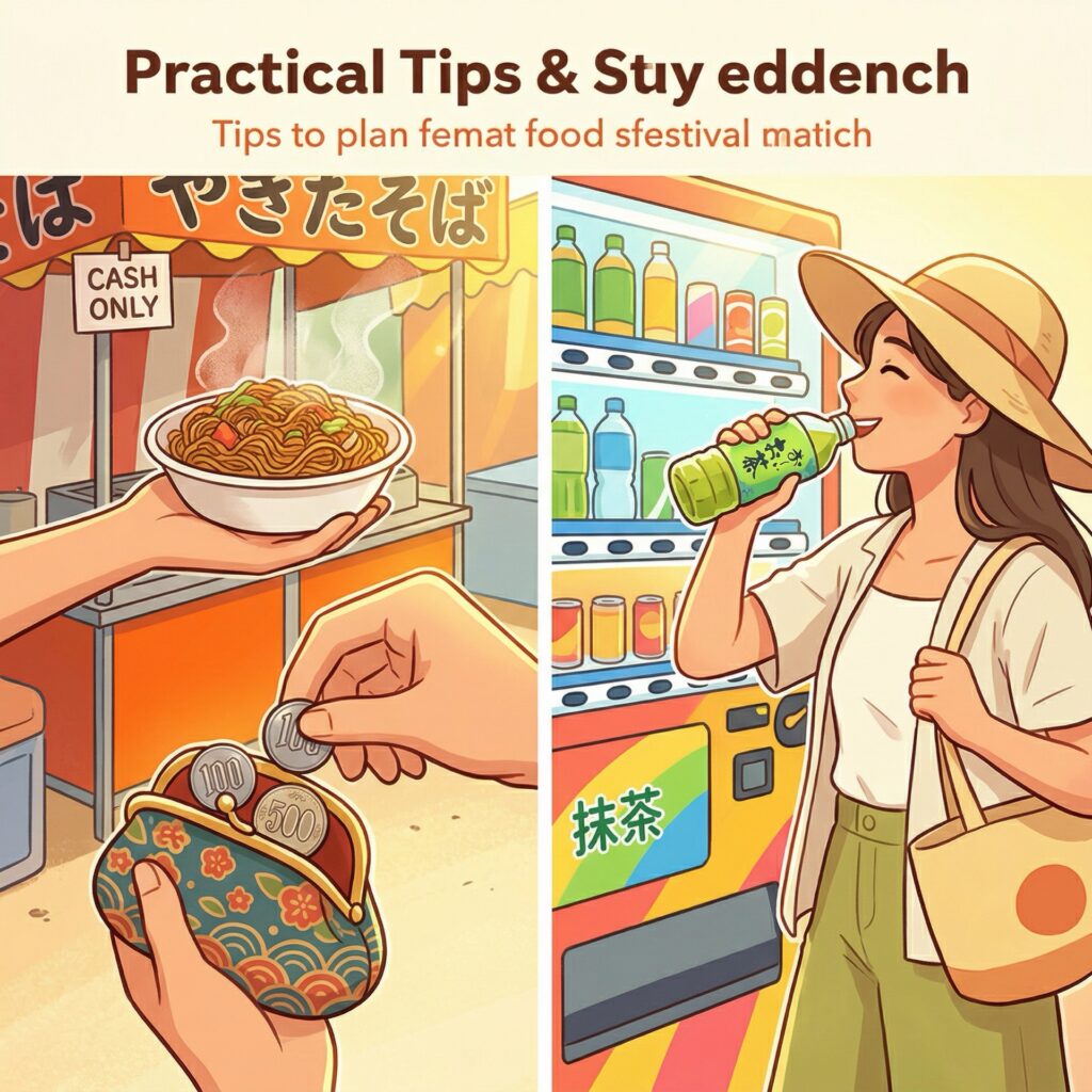 Make sure to carry a dedicated coin purse filled with 100-yen and 500-yen coins. This allows for quick, smooth transactions when buying yakisoba noodles, shaved ice, or traditional sweets from the vendors.